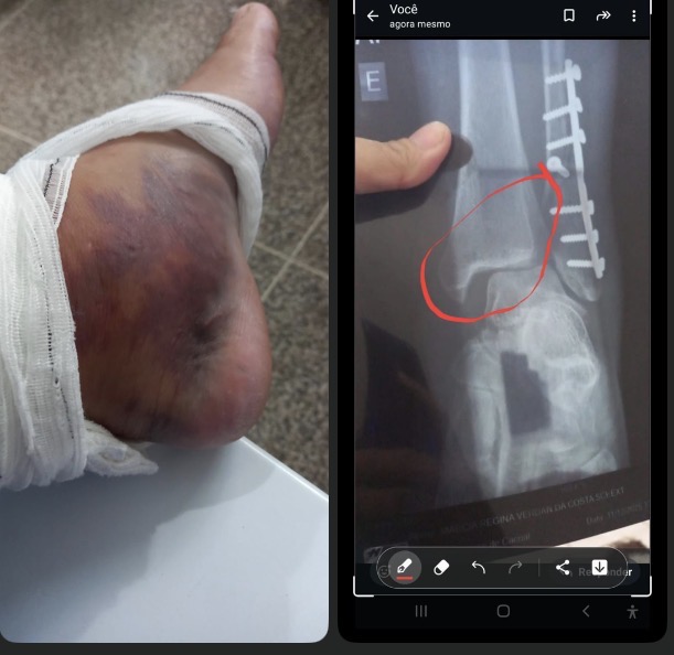 De acordo com o relato, o paciente já havia sido submetido a um procedimento cirúrgico, no qual teria sido utilizado um parafuso a menos do que o necessário, o que teria provocado a deslocação do tornozelo novamente, piorando significativamente o estado clínico e aumentando o risco de complicações.
