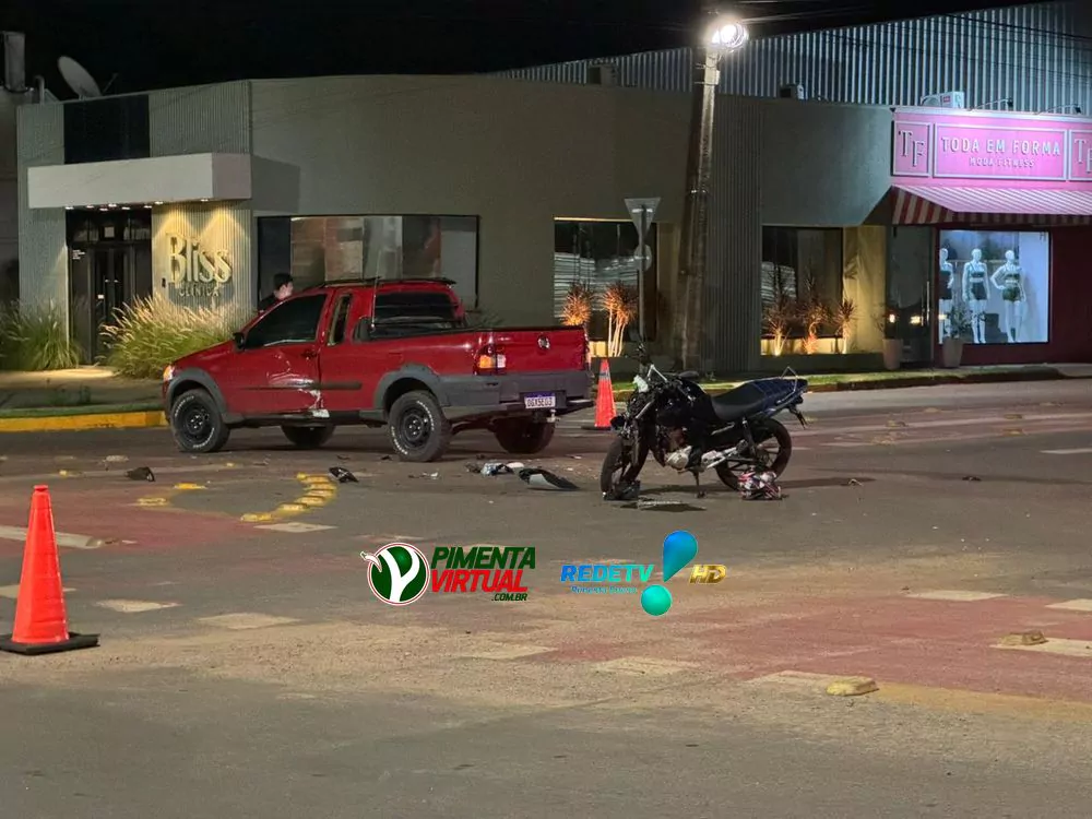 Mulher de 21 anos fica ferida em acidente entre carro e moto na Av. Turíbio Odilon Ribeiro, em Pimenta Bueno