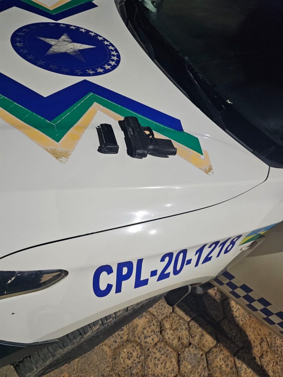 Diante da situação, disse o sargento PM Prates, comandante da Unidade local,  os suspeitos receberam voz de prisão. Durante buscas nas proximidades, os policiais localizaram uma pistola modelo G2C, calibre 9mm, escondida sobre o pneu dianteiro de uma caminhonete estacionada. Inicialmente, os dois negaram a posse da arma, mas posteriormente um deles assumiu ser o proprietário, alegando ter adquirido o armamento em Porto Velho.