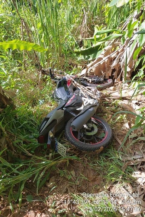 Próximo ao local indicado, foi localizado o veículo – HONDA CG Titan 160, placa RSZ 8H22 caído às margens de um igarapé “brejo”. Ao realiza consultar ao banco de dados confirmou se tratar de veículo roubado no dia 12/02/2026. A guarnição realizou ainda diligências nas proximidades, porém não localizou os dois indivíduos.