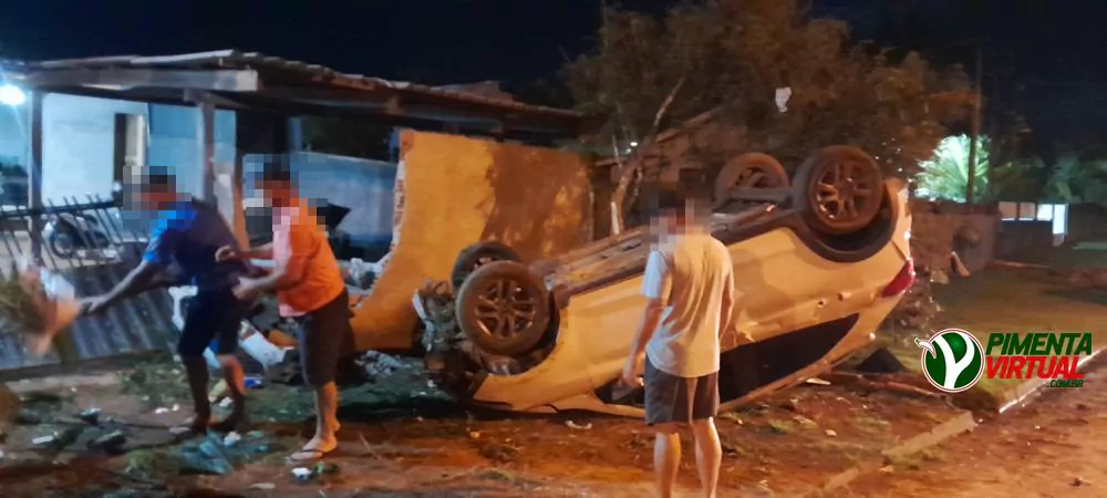 Carro capota após motorista perder controle e atingir muro de residência em Espigão do Oeste