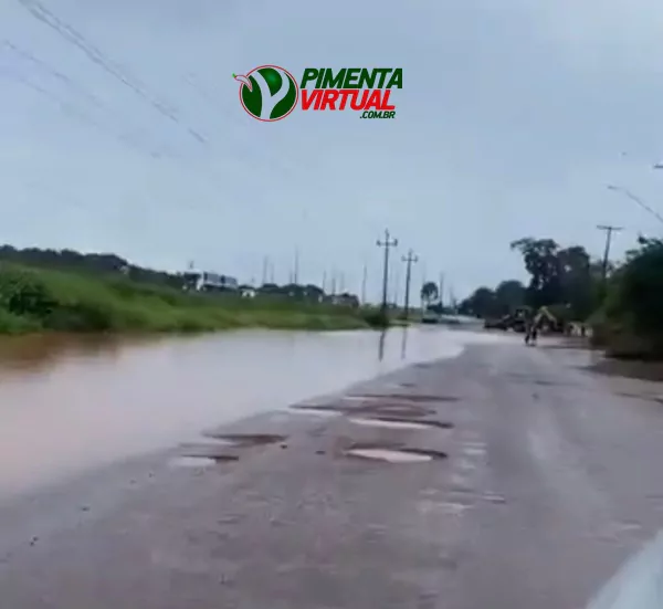 Chuva intensa causa alagamentos e transtornos nas margens BR-364 em Pimenta Bueno