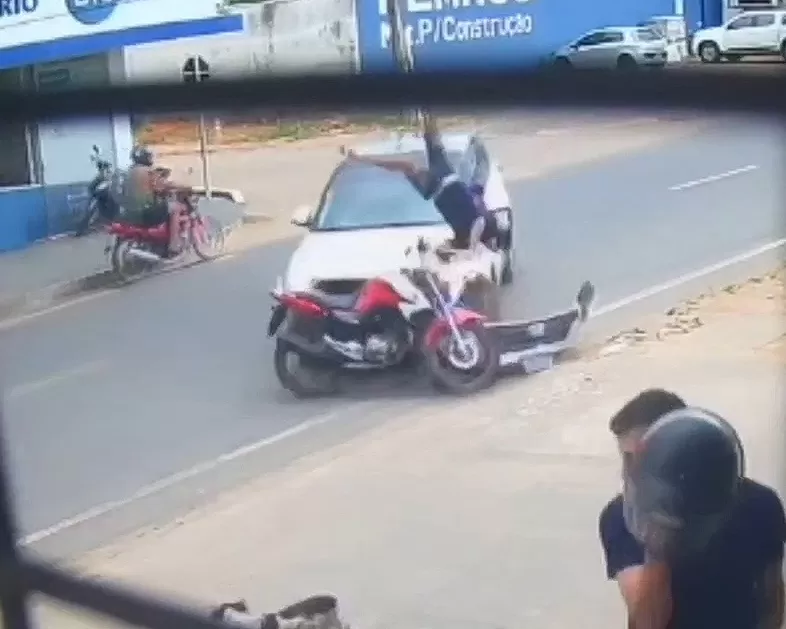 O impacto foi frontal e extremamente violento, arremessando o motociclista a vários metros de altura. Nas imagens, é possível ver o momento em que ele gira no ar antes de cair com força sobre o asfalto. A cena impressionou moradores que estavam próximos e presenciaram a colisão.