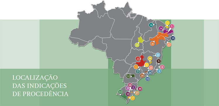 Atualmente o Brasil possui 86 Indicações Geográficas registradas no Instituto Nacional da Propriedade Industrial (INPI), sendo que 67 delas são da espécie Indicação de Procedência e 19 são da espécie Denominação de Origem. Entre elas, as panelas de barro de Goiabeiras, no Espírito Santo; o café da Região do Cerrado Mineiro; o queijo da Canastra, em Minas Gerais; a renda de Divina Pastora em Sergipe, os calçados de Franca, em São Paulo.