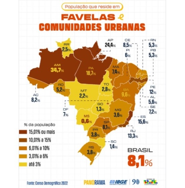 Em todo o país, o levantamento identificou 16,4 milhões de pessoas vivendo em 12.348 favelas, o equivalente a 8,1% da população brasileira. O número representa um crescimento significativo em relação a 2010, quando esse percentual era de 6,0%, indicando avanço da ocupação em áreas com infraestrutura precária.